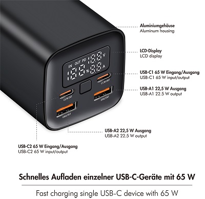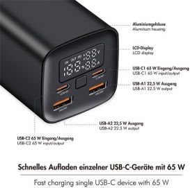 Experience uninterrupted power with this 20,000mAh power bank, offering fast, bidirectional charging with 65W Power Delivery and Quick Charge 3.0. An integrated LCD display accurately shows the remaining charge level, while you can charge up to four devices simultaneously. With an input of up to 65W and an output of up to 90W, it charges both itself and your devices in a flash. Comprehensive protection mechanisms and a robust aluminum casing make it the ideal companion for on the go.